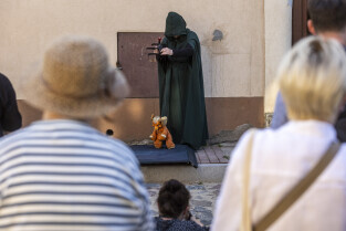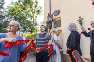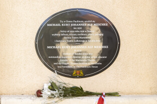 Gdańsk. Na kamienicy przy ulicy Batorego we Wrzeszczu, zawisła tablica upamiętniająca urodzonego w tym domu Michaela Meschke, słynnego twórce teatru lalek.