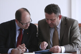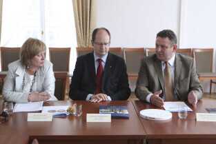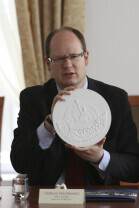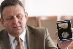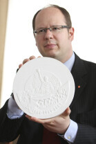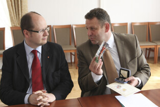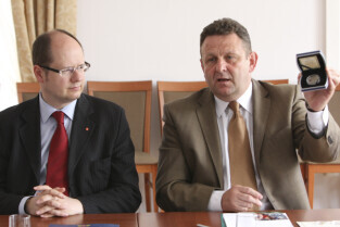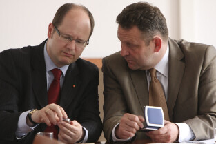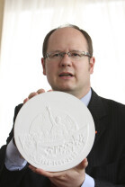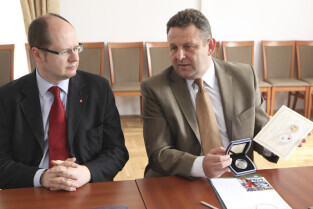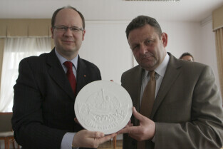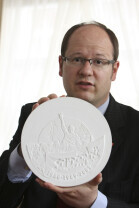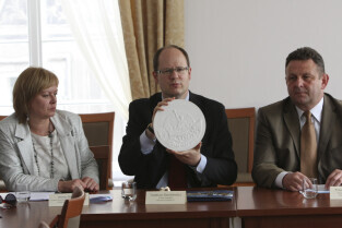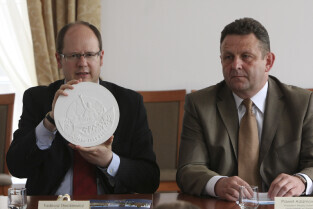 Konferencja prasowa podczas której przedstawiono projekt Talara Gdańskiego, który będzie wyprodukowany przez Mennicę Polską na zamówienie miasta Gdańska z okazji 20. rocznicy wolnych wyborów w Polsce 4 czerwca 1989 r. Nz. Paweł Adamowicz - Prezydent Gdańska (po lewej) i Tadeusz Steckiewicz - Prezes Mennicy Polskiej S.A. z gipsowym projektem Talara Gdańskiego