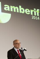 21. Międzynarodowe Targi Bursztynu, Biżuterii i Kamieni Jubilerskich Amberif 2014. Gdańsk, Amber Expo. Nz. Prezes Międzynarodowych Targów Gdańskich Andrzej Kasprzak podczas oficjalnego otwarcia targów