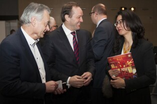 21. Międzynarodowe Targi Bursztynu, Biżuterii i Kamieni Jubilerskich Amberif 2014. Gdańsk, Amber Expo. Nz. Prezydent Gdańska Paweł Adamowicz wita sią delegacją z Kaliningradu