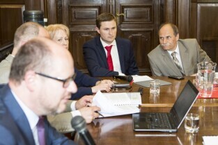 Gdańsk, Nowy Ratusz. Podpisanie umowy ramowej pomiędzy ZHP, a Gdańskiem dotyczącej ubiegania się o organizację The World Scout Jamboree w 2023 r. oraz imprez poprzedzających. Nz. Z-ca Prezydenta Gdańska Piotr Grzelak i Dyrektor Wydziału Gospodarki Komunalnej UMG Dimitris T. Skuras