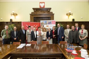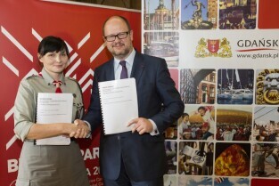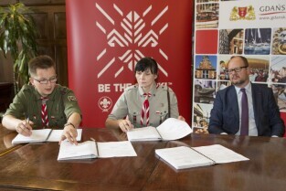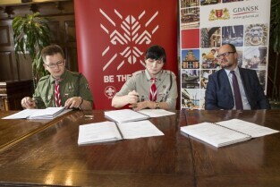 Gdańsk, Nowy Ratusz. Podpisanie umowy ramowej pomiędzy ZHP, a Gdańskiem dotyczącej ubiegania się o organizację The World Scout Jamboree w 2023 r. oraz imprez poprzedzających