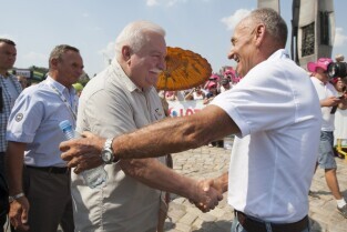 Gdańsk, Plac Solidarności. Start honorowy 71. Tour de Pologne. Nz. były Prezydent RP Lech Wałęsa i Dyrektor Tour de Pologne Czesław Lang
