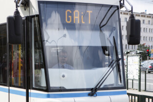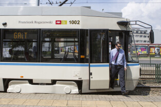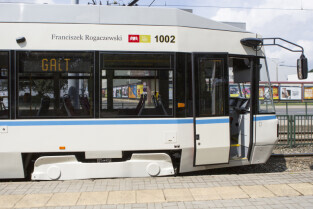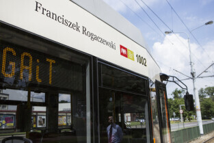Nadanie tramwajowi Alstom NGD99 o numerze 1002 imienia księdza Franciszka Rogaczewskiego. Gdańsk, przystanek "Nowe Ogrody"