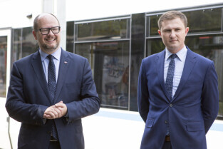 Nadanie tramwajowi Alstom NGD99 o numerze 1002 imienia księdza Franciszka Rogaczewskiego. Gdańsk, przystanek "Nowe Ogrody". Nz. Prezydent Gdańska Paweł Adamowicz i jego Z-ca Piotr Grzelak