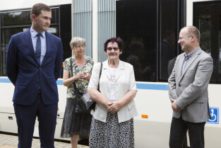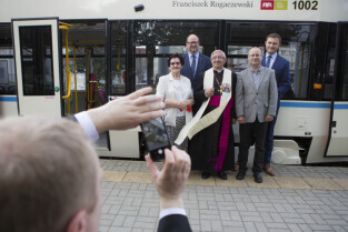 Nadanie tramwajowi Alstom NGD99 o numerze 1002 imienia księdza Franciszka Rogaczewskiego. Gdańsk, przystanek "Nowe Ogrody". Nz. od lewej: Z-ca Prezydenta Gdańska Piotr Grzelak, Janina Rogaczewska (żona śp. Romana Rogaczewskiego - bratanka ks. Rogaczewskiego), Prezes Gdańskich Autobusów i Tramwajów Maciej Lisicki