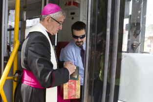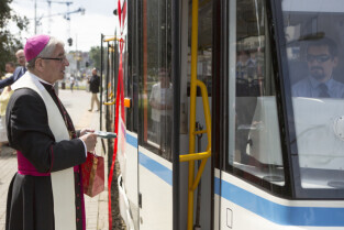 Nadanie tramwajowi Alstom NGD99 o numerze 1002 imienia księdza Franciszka Rogaczewskiego. Gdańsk, przystanek "Nowe Ogrody". Nz. Metropolita Gdański Abp Sławoj Leszek Głódź