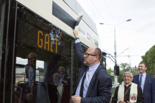 Nadanie tramwajowi Alstom NGD99 o numerze 1002 imienia księdza Franciszka Rogaczewskiego. Gdańsk, przystanek "Nowe Ogrody". Nz. Prezydent Gdańska Paweł Adamowicz
