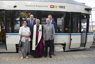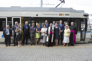 Nadanie tramwajowi Alstom NGD99 o numerze 1002 imienia księdza Franciszka Rogaczewskiego. Gdańsk, przystanek "Nowe Ogrody". Nz. od lewej: Janina Rogaczewska (żona śp. Romana Rogaczewskiego - bratanka ks. Rogaczewskiego), Prezydent Gdańska Paweł Adamowicz, Metropolita Gdański Abp Sławoj Leszek Głódź, Prezes Gdańskich Autobusów i Tramwajów Maciej Lisicki, Z-ca Prezydenta Gdańska Piotr Grzelak