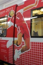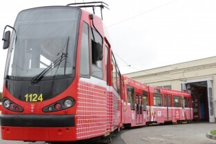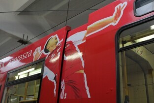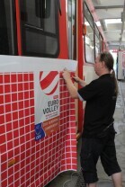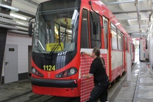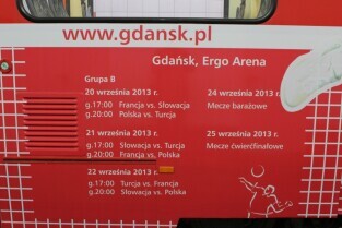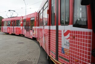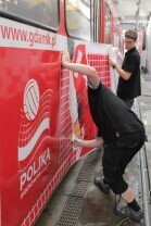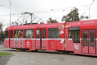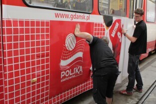 Zajezdnia tramwajowa w Gdańsku. Z okazji zbliżających się Mistrzostw Europy w siatkówce mężczyzn jeden z gdańskich tramwajów został specjalnie oklejony.
