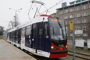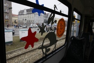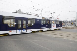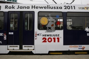 Tramwaj Düwag N8C oklejony "gwiezdnym wzorem" dla uczczenia 400. rocznicy urodzin Jana Heweliusza. W takiej szacie tramwaj będzie jeździł po gdańskich szynach do końca 2011 roku. Gdańsk, ul. 3 Maja