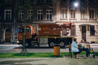 Gdańsk, Dolne Miasto, ul. Wróbla. Operacja ustawiania zabytkowego tramwaju Konstal 105 Na, który będzie atrakcją zrewitalizowanej dzielnicy