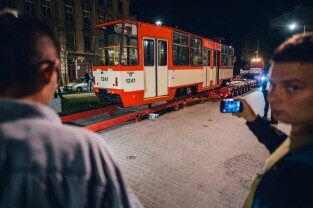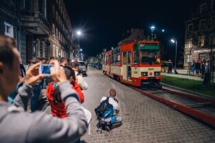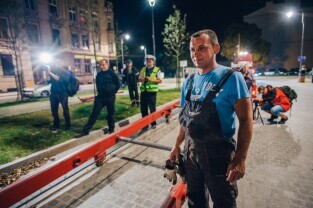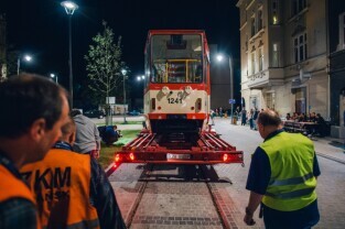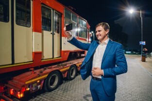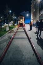 Gdańsk, Dolne Miasto, ul. Wróbla. Operacja ustawiania zabytkowego tramwaju Konstal 105 Na, który będzie atrakcją zrewitalizowanej dzielnicy. Nz. Z-ca Prezydenta Gdańska Piotr Grzelak