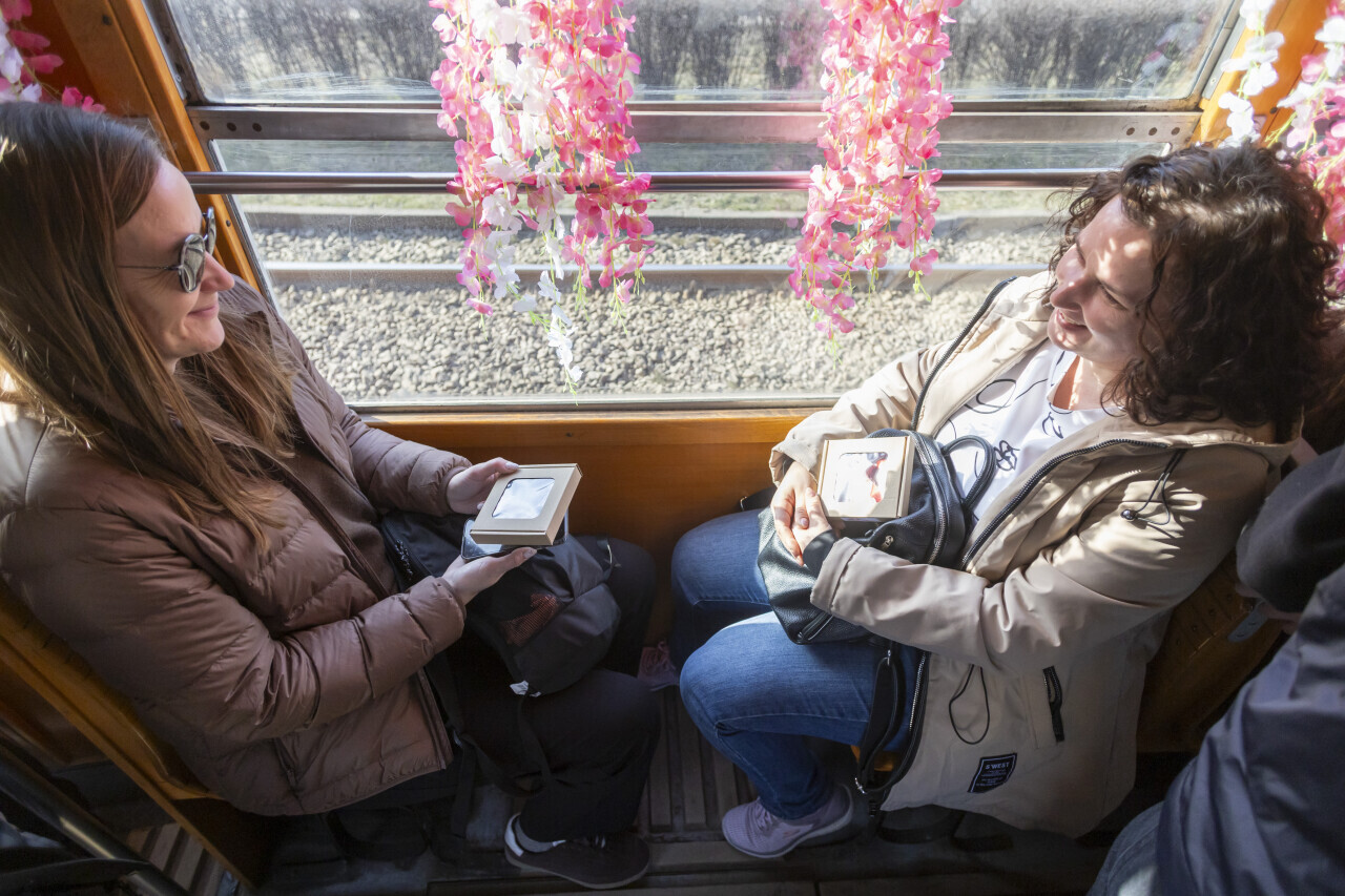 Gdańsk. Z okazji międzynarodowego Dnia Kobiet na ulice miasta wyjechał zabytkowy tramwaj - Konstal N. W trakcie jazdy pasażerki mogły wziąć udział w konkursie muzycznym i spotkać Piotra Borawskiego, zastępcę prezydenta ds. mobilności i bezpieczeństwa, który rozdawał paniom prezenty