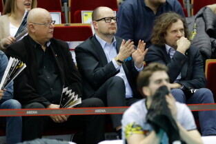 Gdańsk. Mecz siatkówki Trefl Gdańsk - Indykpol AZS Olsztyn. Nz. Andrzej Trojanowski-Biuro Prezydenta ds. Sportu, Prezydent Gdańska Paweł Adamowicz i Prezydent Sopotu Jacek Karnowski.