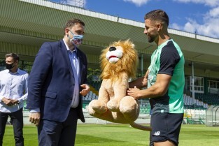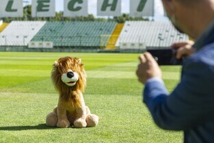 Gdańsk. Stadion Miejski na ul. Traugutta. Trening Lechii Gdańsk przed finałami Pucharu Polski. NZ. Lew - maskotka przygotowana i przekazana przez zastępcę Prezydent Gdańska Piotra Borawskiego.