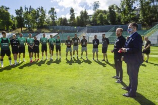 Gdańsk. Stadion Miejski na ul. Traugutta. Trening Lechii Gdańsk przed finałami Pucharu Polski. NZ. Zastępca Prezydent Gdańska Piotr Borawski przekazuje zawodnikom Lwa maskotkę mającą przynieść szczęście.