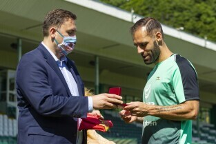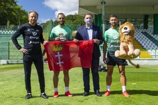 Gdańsk. Stadion Miejski na ul. Traugutta. Trening Lechii Gdańsk przed finałami Pucharu Polski, NZ. ZAstępca Prezydent Gdańska Piotr Borawski wręcza kapitanowi zespołu Flavio Paixao pamiątkową gdańską monetę na szczęście.