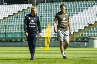 Gdańsk. Stadion Miejski na ul. Traugutta. Trening Lechii Gdańsk przed finałami Pucharu Polski. NZ trener Lechii Gdańsk - Piotr Stokowiec i Jarosław Bieniuk.