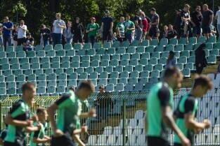Gdańsk. Stadion Miejski na ul. Traugutta. Trening Lechii Gdańsk przed finałami Pucharu Polski. NZ. Kibice obserwują trenig drużyny.