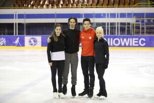 Gdańsk. Trening Justyny Plutowskej i Jeremiego Flemin, łyżwiarzy figurowych GKS Stoczniowiec Gdańsk. Nz. Łyżwiarze (L) Teodora Markova, Simon Daze, Justyna Plutowska i Jeremi Flemin.