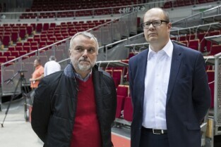 Trening reprezentacji Polski w siatkówce przed rozpoczęciem Mistrzostw Europy w Piłce Siatkowej Mężczyzn 2013. Ergo Arena, Gdańsk-Sopot. Nz. od lewej: Dyrektor Ligi Światowej Siatkówki w Polsce Wojciech Czayka i Prezydent Gdańska Paweł Adamowicz