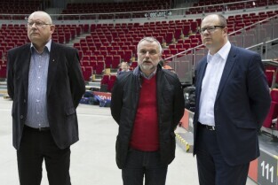 Trening reprezentacji Polski w siatkówce przed rozpoczęciem Mistrzostw Europy w Piłce Siatkowej Mężczyzn 2013. Ergo Arena, Gdańsk-Sopot. Nz. od lewej: Dyrektor Biura Prezydenta Gdańska ds. Sportu Andrzej Trojanowski, Dyrektor Ligi Światowej Siatkówki w Polsce Wojciech Czayka i Prezydent Gdańska Paweł Adamowicz