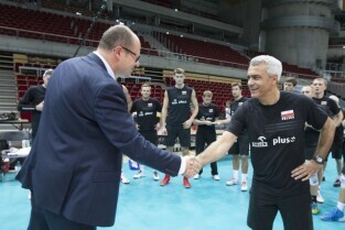 Trening reprezentacji Polski w siatkówce przed rozpoczęciem Mistrzostw Europy w Piłce Siatkowej Mężczyzn 2013. Ergo Arena, Gdańsk-Sopot. Nz. Prezydent Gdańska Paweł Adamowicz i Trener Reprezentacji Polski Andrea Anastasi