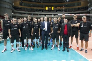 Trening reprezentacji Polski w siatkówce przed rozpoczęciem Mistrzostw Europy w Piłce Siatkowej Mężczyzn 2013. Ergo Arena, Gdańsk-Sopot. Wspólne zdjęcie zawodników i Prezydenta Gdańska Pawła Adamowicza, Trenera Reprezentacji Polski Andrea Anastasi oraz Dyrektora Ligi Światowej w Polsce Wojciecha Czajki