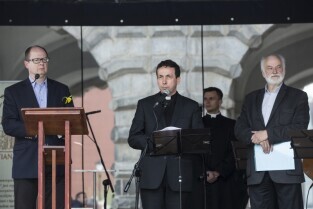 Gdańsk, Długi Targ. Trójmiasto czyta Biblię. Nz. od lewej: Prezydent Gdańska Paweł Adamowicz, Rektor Gdańskiego Seminarium Duchownego ks. Grzegorz Szamocki, Przewodniczący Oddziału w Gdańsku Katolickiego Stowarzyszenia „Civitas Christiana” Grzegorz Pokorniewski