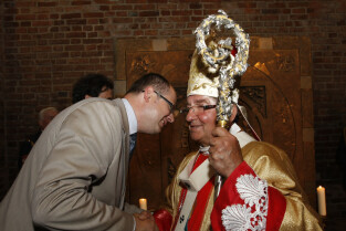 Ołtarz tryptyk wykonany przez gdańskiego artystę Mariusza Drapikowskiego, który powędruje do Jerozolimy. Nz. Arcybiskup Leszek Sławoj-Głódź koło tryptyku.
