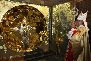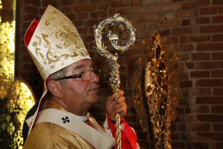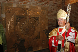 Ołtarz tryptyk wykonany przez gdańskiego artystę Mariusza Drapikowskiego, który powędruje do Jerozolimy. Nz. Arcybiskup Leszek Sławoj-Głódź