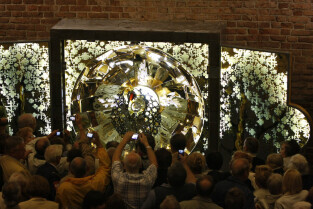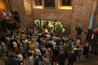 Ołtarz tryptyk wykonany przez gdańskiego artystę Mariusza Drapikowskiego, który powędruje do Jerozolimy. Nz. zaciekawieni wierni oglądający dzieło.