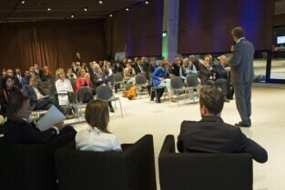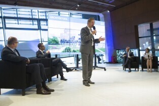 Gdańsk, Europejskie Centrum Solidarności. Prezentacja biurowca Tryton - inwestycji Echo Investments. Nz. Michał Baryżewski (Firma Arch-Deco, projektant budynku)