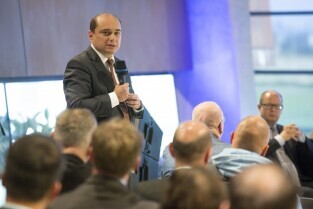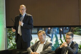 Gdańsk, Europejskie Centrum Solidarności. Prezentacja biurowca Tryton - inwestycji Echo Investments. Nz. Wiceprezes Zarządu Echo Investment Artur Langner