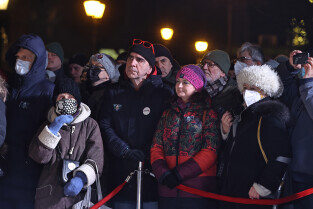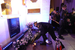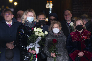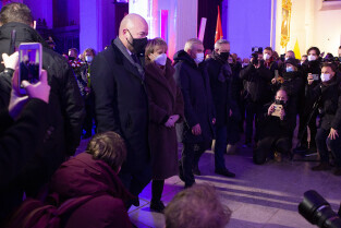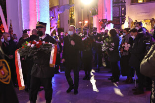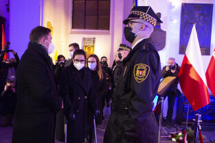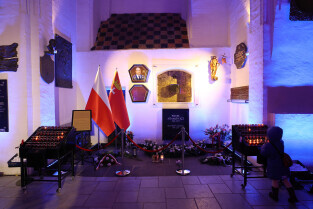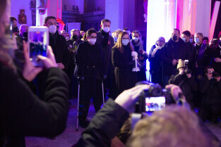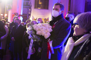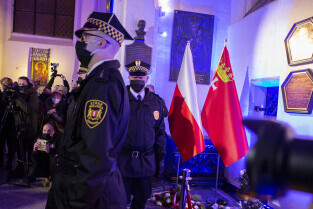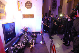 Gdańsk.Uroczystości w trzecią rocznicę zamachu na prezydenta Gdańska Pawła Adamowicza. Złożenie kwiatów na pamiątkowej tablicy przy Złotej Bramie oraz na grobie w Bazylice Mariackiej w Gdańsku.