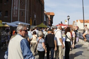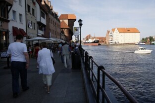 Turyści w spacerujący Długim Pobrzeżem w Gdańsku