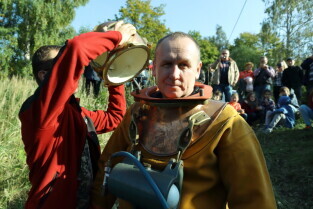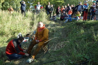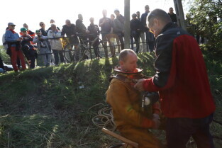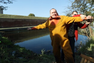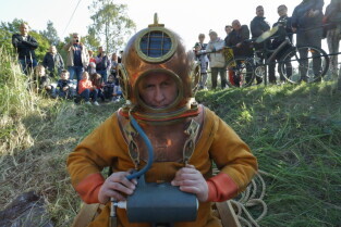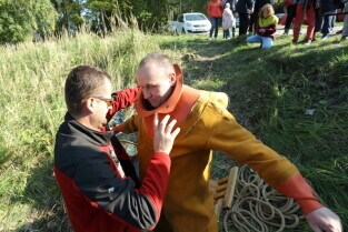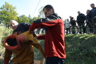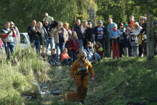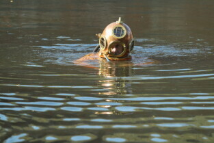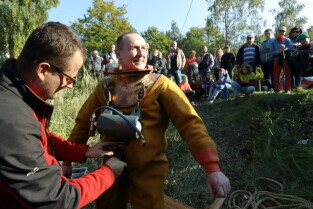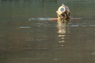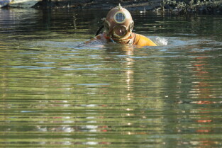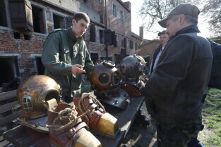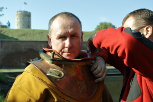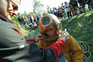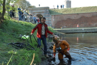 Gdańsk. Twierdza Wisłoujście - ostatnie zwiedzanie w tym roku. Nz. Pokaz nurkowania klasycznego, Lech Trawicki (nurek) i Mirosław Murczkiewicz.