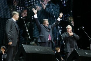 Widowisko plenerowe "Solidarność. Twój anioł Wolność ma na imię!" w ramach 30. rocznicy Sierpnia'80 w reżyserii Roberta Wilsona. Gdańsk, Stocznia Gdańska. Nz. od lewej: Dyrektor ECS o. Maciej Zięba, Prezydent RP Bronisław Komorowski, były Prezydent RP Lech Wałęsa