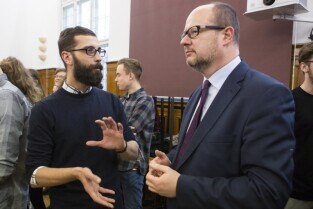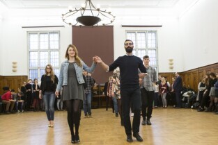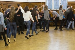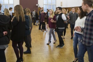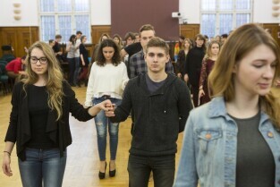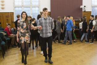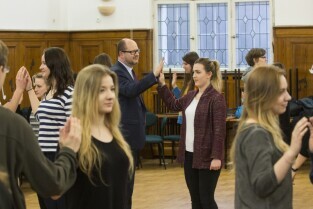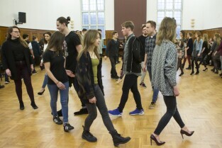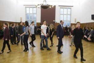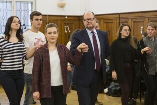 Gdańsk Oliwa. Uczniowie V Liceum Ogólnokształcącego i Prezydent Gdańska Paweł Adamowicz ćwiczą poloneza przed swoją Studniówką zaplanowaną na najbliższą sobotę