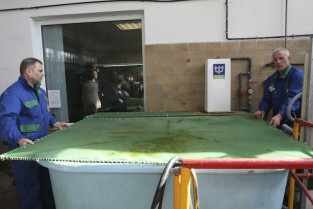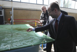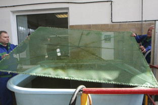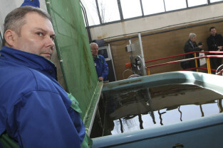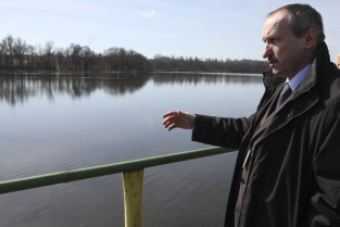 Ujęcie wody w Straszynie zarządzane przez spółkę Saur Neptun Gdańsk. Nz. Maciej Lisicki (z-ca Prezydenta Gdańska) karmiący pstrągi używane do monitorowania stanu czystości wody