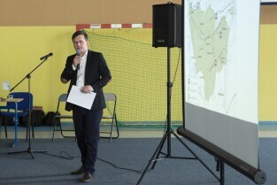 Spotkanie konsultacyjne z mieszkańcami dotyczące rozbudowy układu transportowego Gdańska Południe w latach 2014-2020. Gdańsk Ujeścisko, Szkoła Podstawowa nr 12. Nz. Dyrektor Wydziału Programów Rozwojowych UMG Marcin Dawidowski