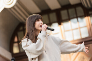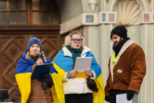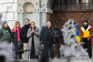 Gdańsk, ul. Długi Targ. Ukraina pod rakietami. Zgromadzenie organizacji pozarządowych. Nz. Monika Chabior, zastępczyni Prezydenta Gdańska