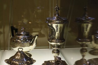 Maselniczka ze srebra (na pierwszym planie po lewej), Carl Moritz Stumpf, Gdańsk, między 1840-45. Z kolekcji przekazanej Muzeum Historycznemu Miasta Gdańska.