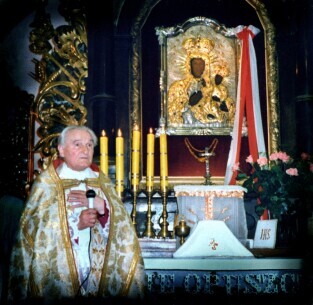 Ksiądz Kazimierz Filipiak przy cudownym obrazie Płaczącej Madonny w przyparafialnym Diecezjalnym Sanktuarium Matki Bożej Łaskawej, ok. 1985 r. Ksiądz Filipiak odegrał ogromną rolę w historii gdańskiej diaspory ormiańskiej.
