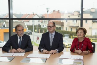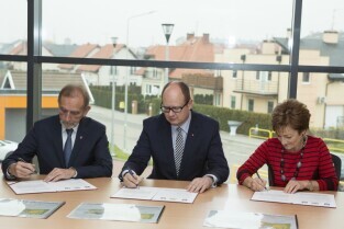 Podpisanie umowy dotyczącej szkoły w Kowalach - wspólnej inwestycji oświatowej Kolbud, Pruszcza Gdańskiego i Gdańska. Gdańsk Karczemki, Pozytywna Szkoła Podstawowa. Nz. od lewej: Wójt Gminy Kolbudy Leszek Grombala, Prezydent Gdańska Paweł Adamowicz, Wójt Gminy Pruszcz Gdański Magdalena Kołodziejczak