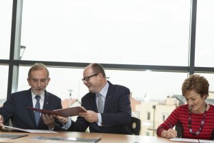 Podpisanie umowy dotyczącej szkoły w Kowalach - wspólnej inwestycji oświatowej Kolbud, Pruszcza Gdańskiego i Gdańska. Gdańsk Karczemki, Pozytywna Szkoła Podstawowa. Nz. od lewej: Michał Piotrowski (Biuro Prasowe UMG), Dyrektor Dyrekcji Rozbudowy Miasta Gdańska Włodzimierz Bartosiewicz, Wójt Gminy Kolbudy Leszek Grombala, Prezydent Gdańska Paweł Adamowicz, Wójt Gminy Pruszcz Gdański Magdalena Kołodziejczak