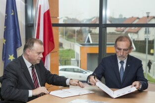 Podpisanie umowy dotyczącej szkoły w Kowalach - wspólnej inwestycji oświatowej Kolbud, Pruszcza Gdańskiego i Gdańska. Gdańsk Karczemki, Pozytywna Szkoła Podstawowa. Nz. od lewej: Dyrektor Dyrekcji Rozbudowy Miasta Gdańska Włodzimierz Bartosiewicz i Wójt Gminy Kolbudy Leszek Grombala