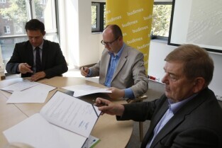 Podpisanie umowy na III etap Trasy Słowackiego, który przebiegać będzie w sąsiedztwie stadionu PGE Arena i połączy al. Hallera z al. Marynarki Polskiej. Siedziba spółki Gdańskie Inwestycje Komunalne. Nz. od prawej: Prezes społki GIK Ryszard Trykosko, Prezydent Gdańska Paweł Adamowicz, Dyrektor gdańskiego oddziału firmy Budimex Dariusz Taraszkiewicz