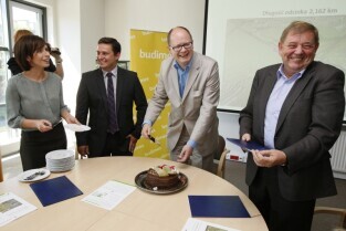 Podpisanie umowy na III etap Trasy Słowackiego, który przebiegać będzie w sąsiedztwie stadionu PGE Arena i połączy al. Hallera z al. Marynarki Polskiej. Siedziba spółki Gdańskie Inwestycje Komunalne. Nz. od prawej: Prezes społki GIK Ryszard Trykosko, Prezydent Gdańska Paweł Adamowicz, Dyrektor gdańskiego oddziału firmy Budimex Dariusz Taraszkiewicz, Rzecznik prasowy społki GIK Magdalena Skorupko-Kaczmarek